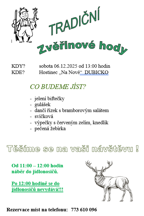 Zveme vás na gastronomickou akci, která se koná v sobotu 6. prosince 2025 od 13:00 hodin v hostinci „Na Nové“ na Dubicku. Přijďte si vychutnat širokou nabídku pokrmů, jako jsou jelení biftečky, gulášek, dančí řízek s bramborovým salátem, svíčková, výpečky s červeným zelím a pečená žebírka. Pro zájemce bude také probíhat nabírání jídel do jídlonosičů od 11:00 do 12:00 hodin. Nezapomeňte si .